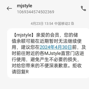 “亲爱的会员,您的储值余额可能在近期暂时无法继续使用,建议您在2024年4月30日前,及时前往附近的各MJstyle直营门店进行使用……”