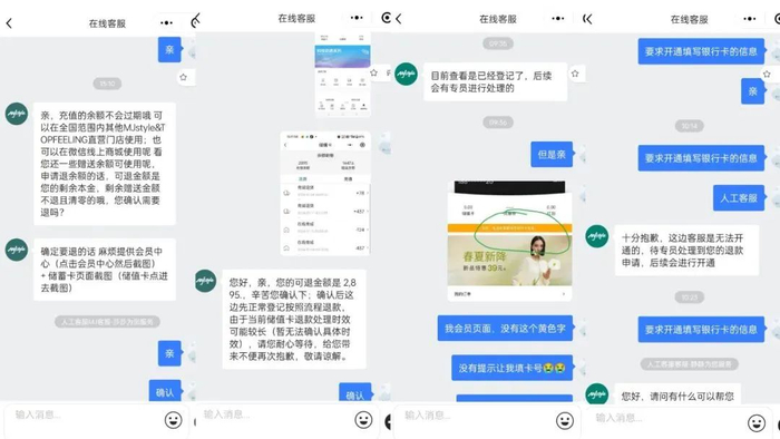 有消费者称,自己在MJstyle的储值余额为4342.60元,其中可退款部分为2895元,此前充值赠送的1447.6元无法退还。事发后,她一直尝试联系小程序端人工客服。4月23日17时许,客服同意为其进行退款登记,但也表示“当前储值卡退款处理时效可能较长,暂无法确认具体时效。”此后,该消费者多次要求填写退还余额的银行卡号,但客服仅表示“目前查看到您已经登记了,后续会有专员进行处理”,之后便没有进一步反馈。