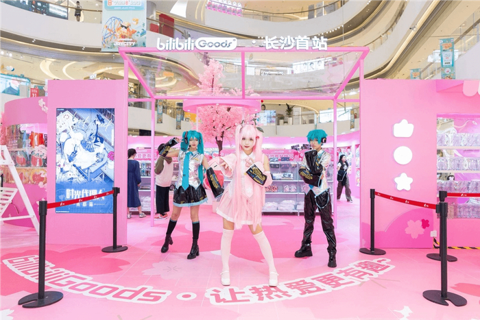 bilibiliGoods快闪长沙首站,则在长沙北辰三角洲大悦城的L1主中庭落地了粉色系展区,集结初音未来、天官赐福、时光代理人、洛天依等多个B站人气IP,用二次元文化收割了一大波年轻消费者。