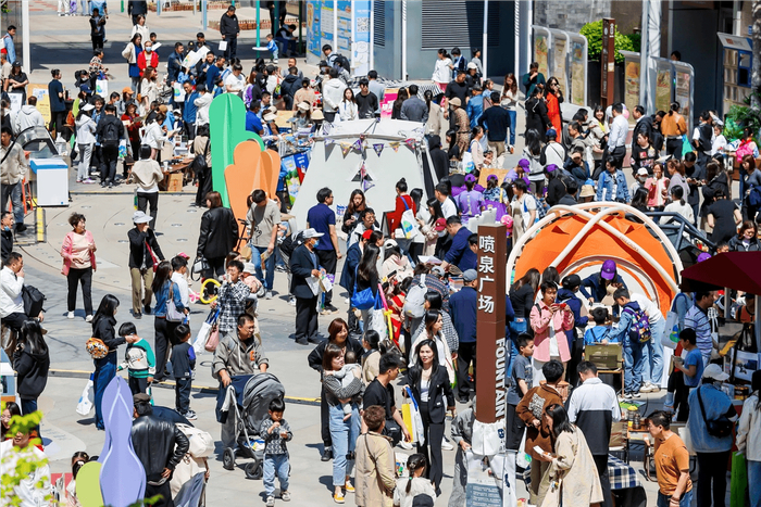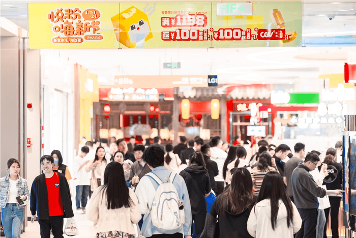 国潮与春日应景应时,将传统姑苏文化用更新潮的手法进行呈现与表达,从现场客流和氛围来看,年轻一代消费者人群占大多数。