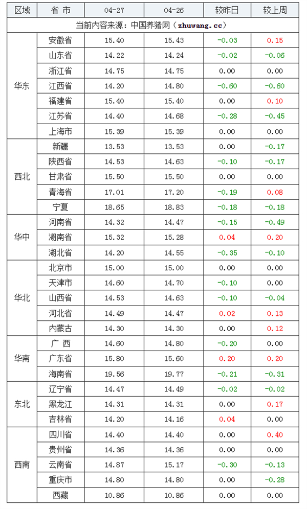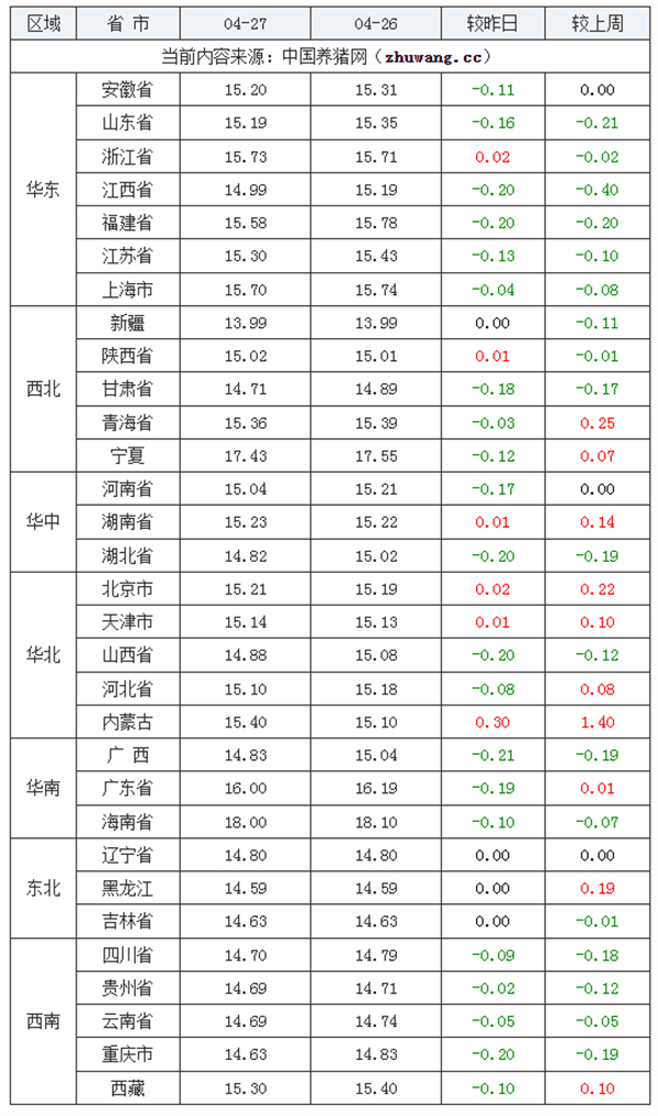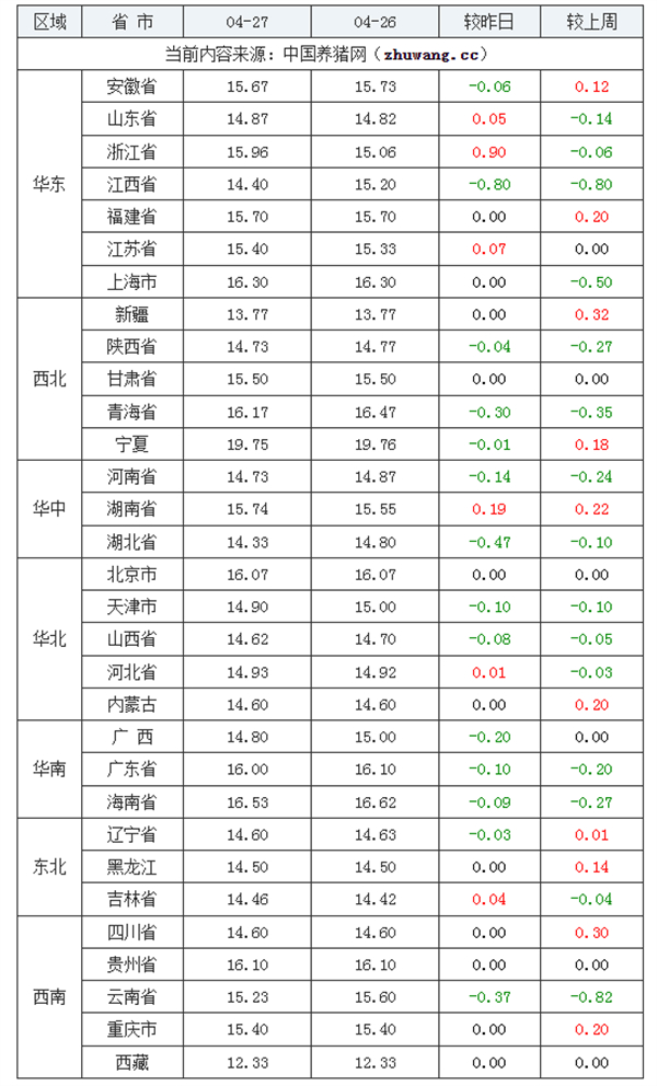 猪价下跌地区(21个):青海省、宁夏回族自治区、安徽省、江苏省、甘肃省、河南省、广西壮族自治区、广东省、贵州省、重庆市、湖北省、山西省、河北省、海南省、西藏自治区、山东省、江西省、福建省、上海市、四川省、云南省;下跌区间:0.02-0.21元/公斤;