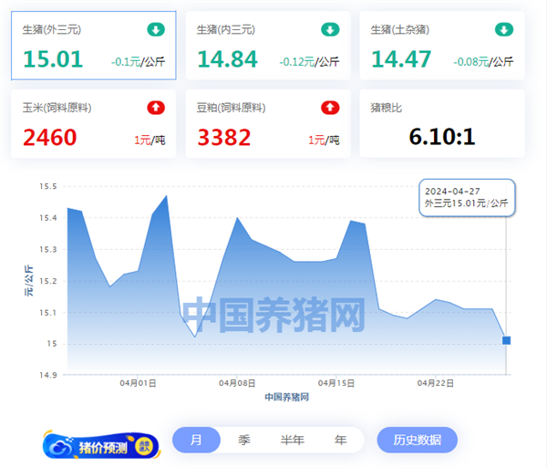 全国均价为15.01元/公斤,猪价较昨日下跌了0.10元/公斤,环比下跌2.72%,同比上涨1.97%;