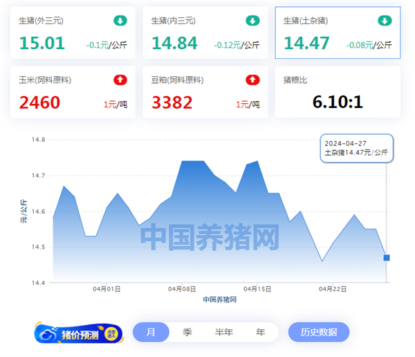 全国均价为14.47元/公斤,猪价较昨日下跌了0.08元/公斤,环比下跌0.75%,同比上涨2.84%;
