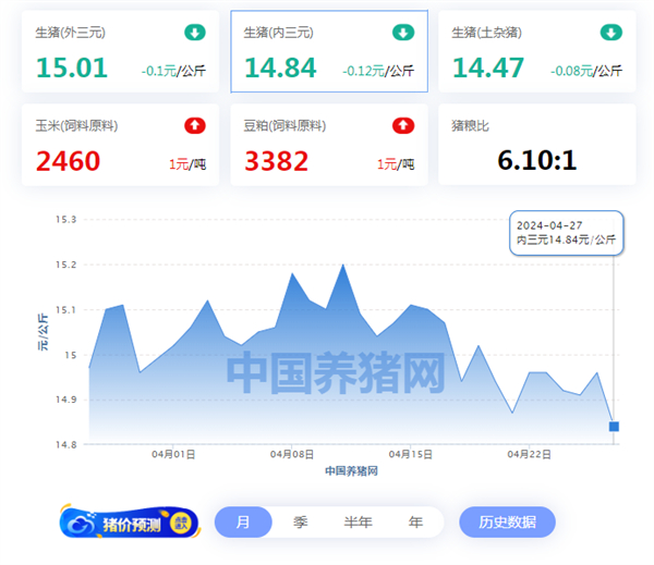 全国均价为14.84元/公斤,猪价较昨日下跌了0.12元/公斤,环比下跌0.87%,同比上涨1.30%;