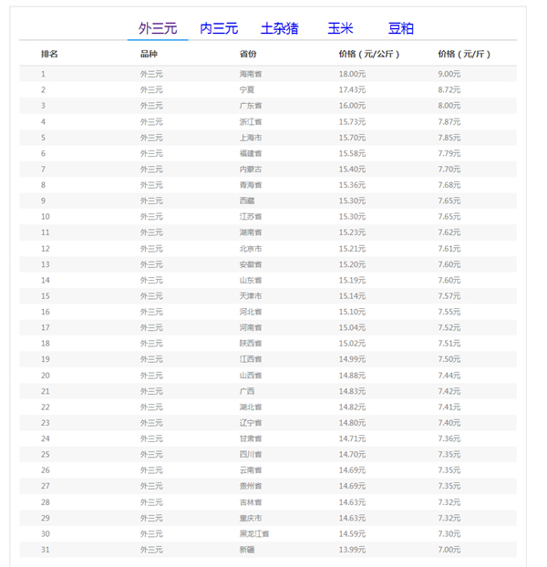 外三元排行前三:海南省18.00元/公斤、宁夏回族自治区17.43元/公斤、广东省16.00元/公斤;