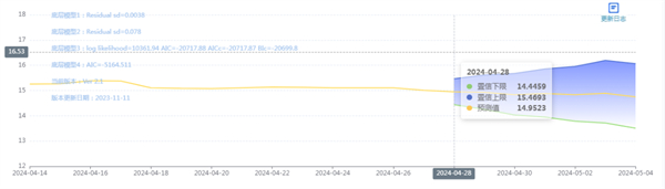 玄田算法是由项目课题组团队原创的非经典逻辑数值聚合理论和不确定性预测方法,构建了基于一致模算子的生猪价格预测模型。该模型采用的聚合函数及一致模相关理论与方法已获得多项国家自然科学基金和省级自然科学资金资助,并获得多项省级自然科学奖奖项。04月28日预测猪价为14.9523,置信区间在14.4459--15.4693之间。04月29日预测猪价为14.9284;04月30日预测猪价为14.8402。