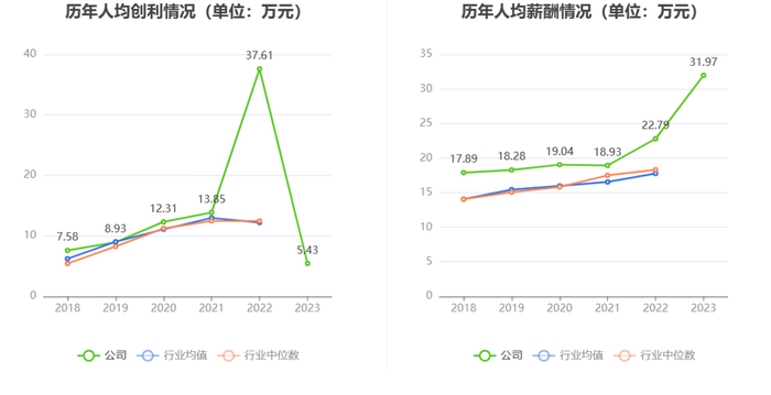 截至2023年末,公司员工总数为4915人,人均创收74.62万元,人均创利5.43万元,人均薪酬31.97万元,较上年同期分别变化-43.44%、-85.56%、40.25%。