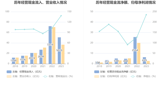 2023年,公司营业收入现金比为138.46%,净现比为235.73%。