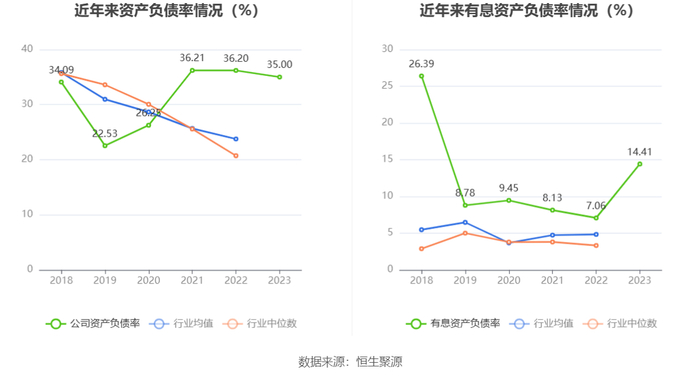 在偿债能力方面,公司2023年年末资产负债率为35.00%,相比上年末下降1.20个百分点;有息资产负债率为14.41%,相比上年末上升7.35个百分点。