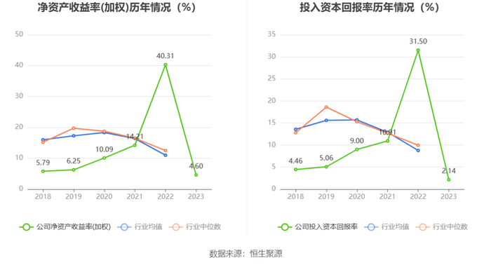 数据显示,2023年公司加权平均净资产收益率为4.60%,较上年同期下降35.71个百分点;公司2023年投入资本回报率为2.14%,较上年同期下降29.36个百分点。