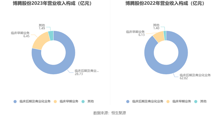 分产品来看,2023年公司主营业务中,临床后期及商业化业务收入28.73亿元,同比下降54.27%,占营业收入的78.34%;临床早期业务收入6.45亿元,同比增长5.10%,占营业收入的17.58%。