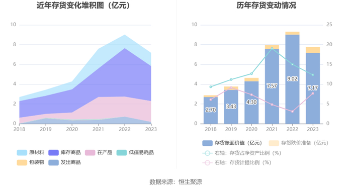 从存货变动来看,截至2023年年末,公司存货账面价值为7.17亿元,占净资产的12.36%,较上年末减少1.85亿元。其中,存货跌价准备为5962.67万元,计提比例为7.68%。