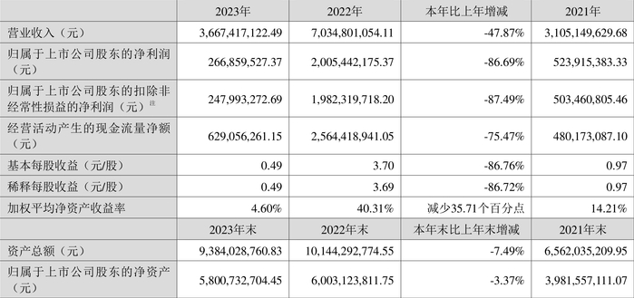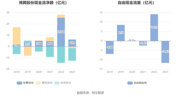 2023年,公司经营活动现金流净额为6.29亿元,同比下降75.47%;筹资活动现金流净额-1.29亿元,同比减少3.89亿元;投资活动现金流净额-11.15亿元,上年同期为-14.36亿元。