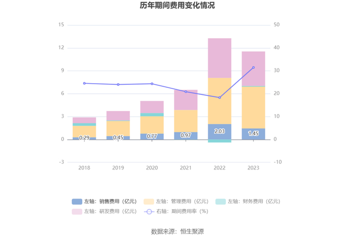 2023年,公司期间费用为11.54亿元,较上年同期减少1.34亿元;但期间费用率为31.47%,较上年同期上升13.15个百分点。其中,销售费用同比下降28.82%,管理费用同比下降9.25%,研发费用同比下降12.95%,财务费用由去年同期的-3862.68万元变为880.81万元。
