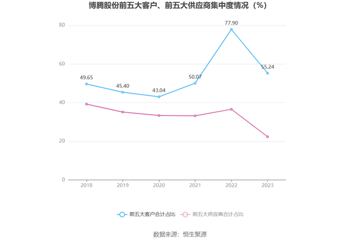 报告期内,公司前五大客户合计销售金额20.26亿元,占总销售金额比例为55.24%,公司前五名供应商合计采购金额2.15亿元,占年度采购总额比例为22.35%。