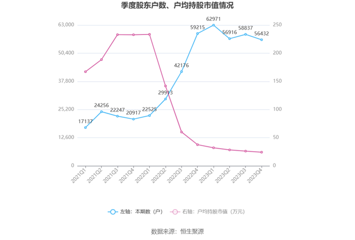 筹码集中度方面,截至2023年年末,公司股东总户数为5.64万户,较三季度末下降了2405户,降幅4.09%;户均持股市值由三季度末的26.25万元下降至24.34万元,降幅为7.28%。