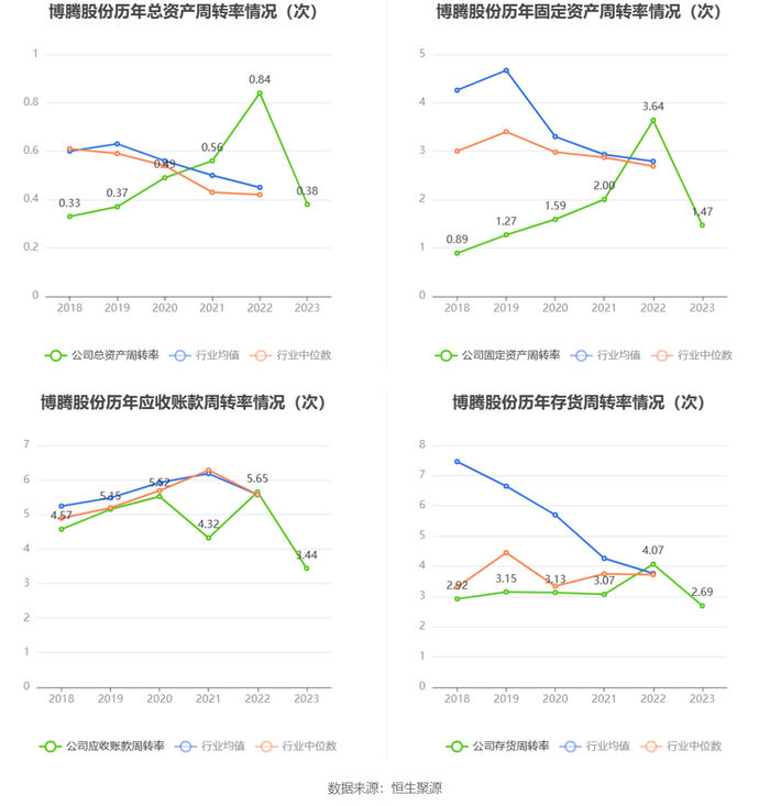 营运能力方面,2023年,公司公司总资产周转率为0.38次,上年同期为0.84次(2022年行业平均值为0.45次,公司位居同行业1/28);固定资产周转率为1.47次,上年同期为3.64次(2022年行业平均值为2.79次,公司位居同行业9/28);公司应收账款周转率、存货周转率分别为3.44次、2.69次。