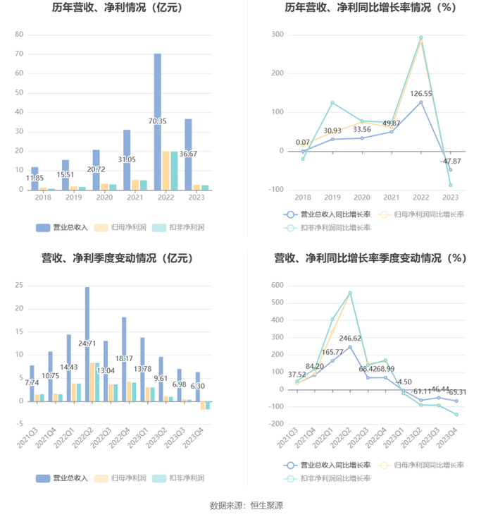 2023年,公司毛利率为40.69%,同比下降11.27个百分点;净利率为4.79%,较上年同期下降22.74个百分点。从单季度指标来看,2023年第四季度公司毛利率为15.10%,同比下降35.14个百分点,环比下降27.57个百分点;净利率为-29.65%,较上年同期下降53.25个百分点,较上一季度下降30.26个百分点。
