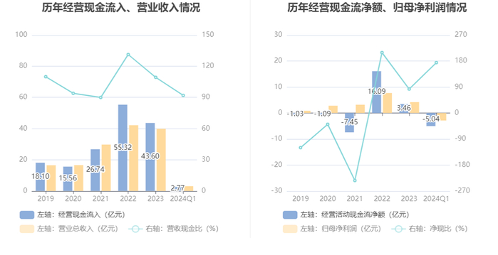 2024年第一季度,公司经营活动现金流净额为-5.04亿元,同比减少4.47亿元,主要系销售商品、提供劳务收到的现金较上年同期减少较大影响所致;筹资活动现金流净额-712.65万元,同比减少1.66亿元,主要系本期借款减少影响所致;投资活动现金流净额-3453.77万元,上年同期为-1720.86万元。