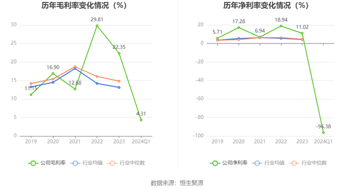 2024年第一季度,公司毛利率为4.31%,同比下降14.27个百分点;净利率为-96.38%,较上年同期下降102.84个百分点。