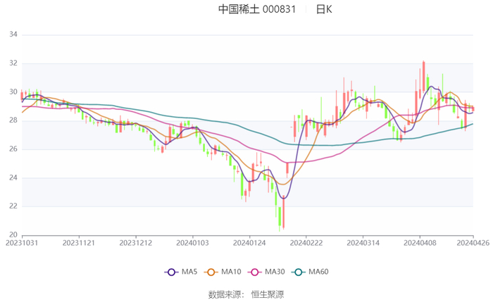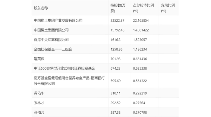 一季报显示,2024年一季度末公司十大流通股东中,持股最多的为中国稀土集团产业发展有限公司,占比22.17%。十大流通股东名单相比2023年年报维持不变。在具体持股比例上,潘英俊、中证500交易型开放式指数证券投资基金持股有所上升,香港中央结算有限公司、南方基金稳健增值混合型养老金产品-招商银行股份有限公司持股有所下降。