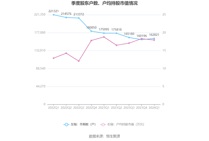 筹码集中度方面,截至2024年一季度末,公司股东总户数为16.28万户,较上年末增长了2625户,增幅1.64%;户均持股市值由上年末的18.33万元下降至17.95万元,降幅为2.07%。