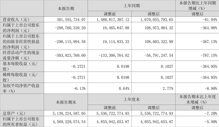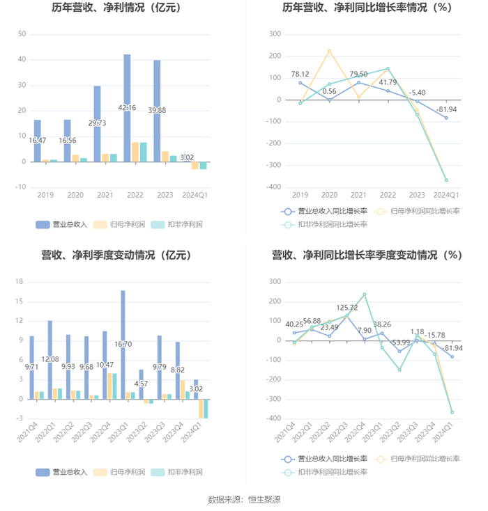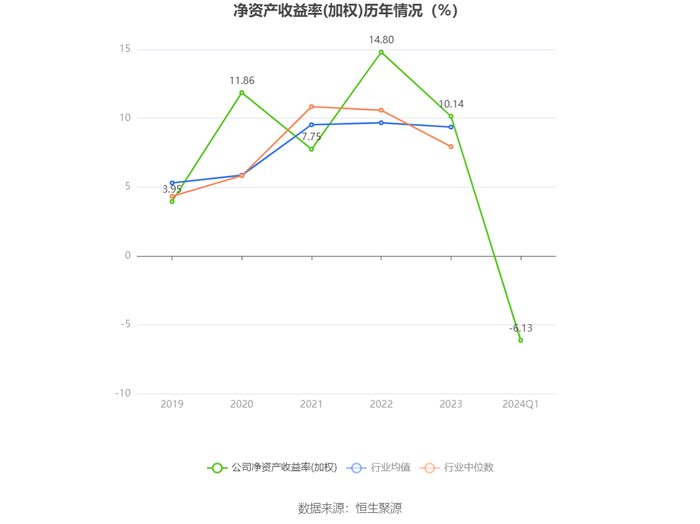 数据显示,2024年第一季度公司加权平均净资产收益率为-6.13%,较上年同期下降8.9个百分点;公司2024年第一季度投入资本回报率为-7.37%,较上年同期下降7.86个百分点。