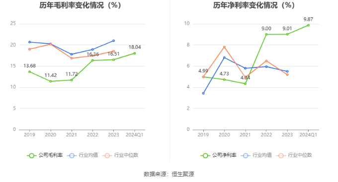 2024年第一季度,公司毛利率为18.04%,同比上升2.22个百分点;净利率为9.87%,较上年同期上升1.02个百分点。
