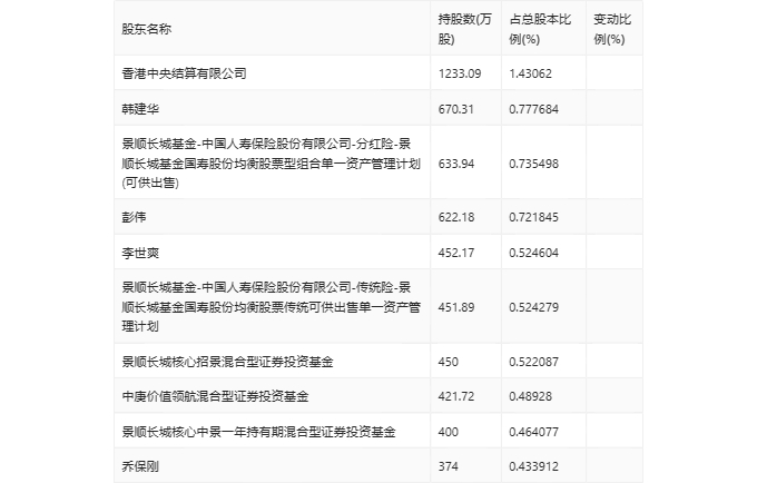 一季报显示,2024年一季度末公司十大流通股东中,新进股东为中庚价值领航混合型证券投资基金,取代了上年末的光大永明资管-兴业银行-光大永明资产聚财121号定向资产管理产品。在具体持股比例上,香港中央结算有限公司、景顺长城基金-中国人寿保险股份有限公司-传统险-景顺长城基金国寿股份均衡股票传统可供出售单一资产管理计划持股有所上升,李世爽、景顺长城核心招景混合型证券投资基金、景顺长城核心中景一年持有期混合型证券投资基金、乔保刚持股有所下降。