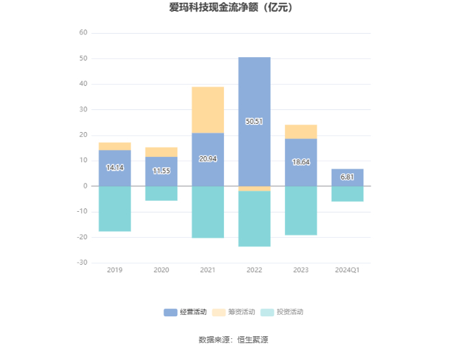 2024年第一季度,公司经营活动现金流净额为6.81亿元,同比下降51.09%,主要系报告期内营业收入同比下降导致收到的现金减少及以现金方式支付的采购款项同比增加;筹资活动现金流净额-4.54万元,同比减少19.60亿元;投资活动现金流净额-5.93亿元,上年同期为1707.4万元。