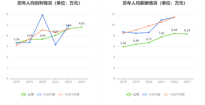 截至2023年末,公司员工总数为2781人,人均创收68.35万元,人均创利4.83万元,人均薪酬8.34万元,较上年同期分别变化0.97%、3.92%、-1.16%。