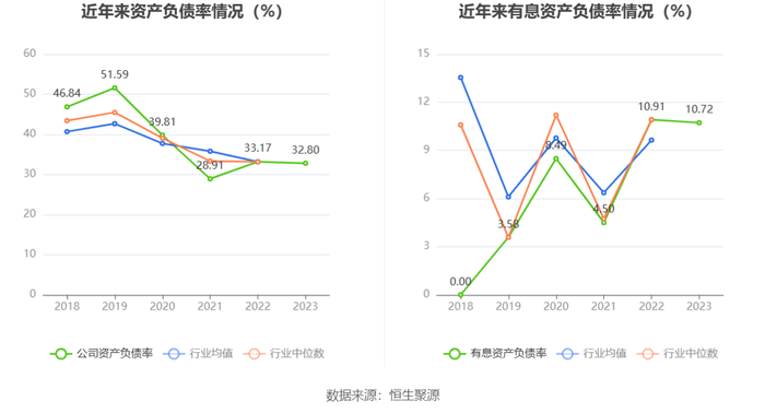 在偿债能力方面,公司2023年年末资产负债率为32.80%,相比上年末下降0.37个百分点;有息资产负债率为10.72%,相比上年末下降0.19个百分点。