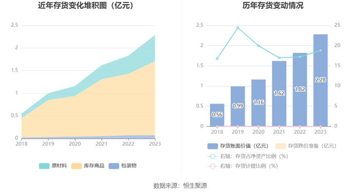 从存货变动来看,截至2023年年末,公司存货账面价值为2.28亿元,占净资产的18.8%,较上年末增加4601.82万元。根据财报,公司本期没有计提存货跌价准备。