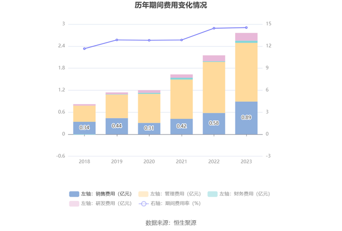 2023年,公司期间费用为2.76亿元,较上年同期增加6138.78万元;期间费用率为14.53%,较上年同期上升0.09个百分点。其中,销售费用同比增长52.52%,管理费用同比增长15.29%,研发费用同比增长33.49%,财务费用同比增长250.96%。