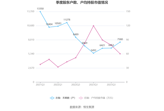 筹码集中度方面,截至2023年年末,公司股东总户数为7580户,较三季度末增长了1128户,增幅17.48%;户均持股市值由三季度末的78.63万元下降至60.36万元,降幅为23.24%。