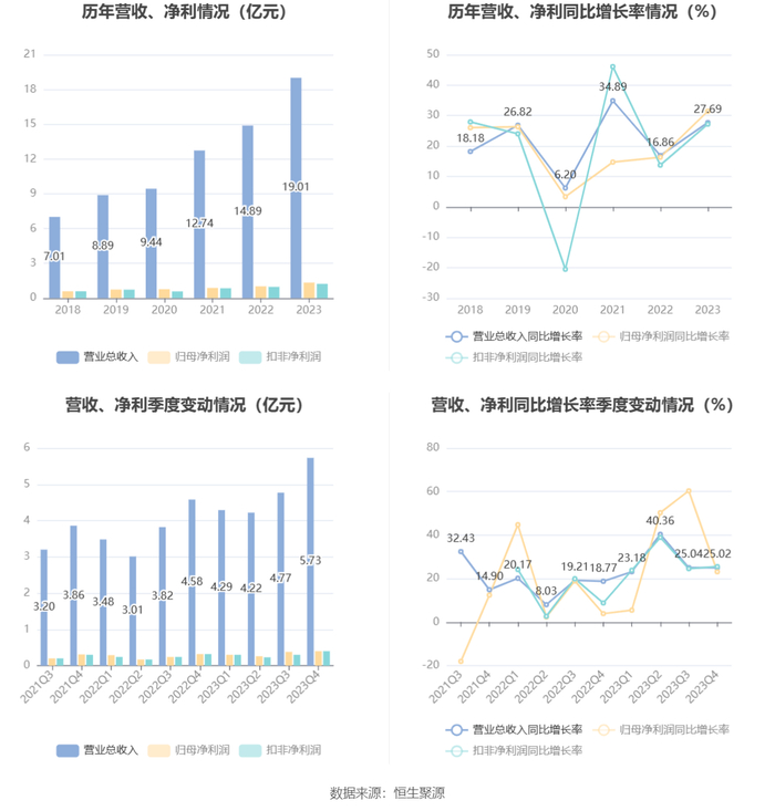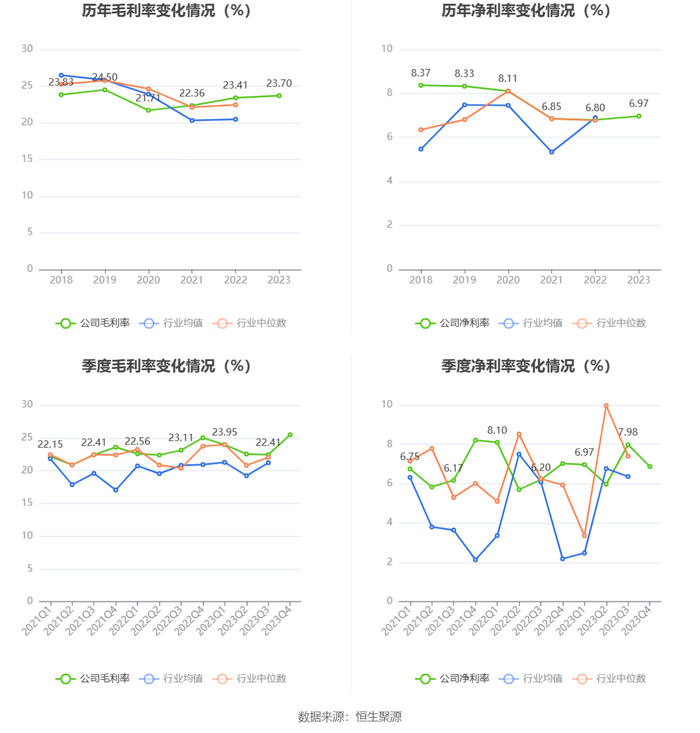 2023年,公司毛利率为23.70%,同比上升0.29个百分点;净利率为6.97%,较上年同期上升0.17个百分点。从单季度指标来看,2023年第四季度公司毛利率为25.46%,同比上升0.46个百分点,环比上升3.05个百分点;净利率为6.87%,较上年同期下降0.15个百分点,较上一季度下降1.11个百分点。