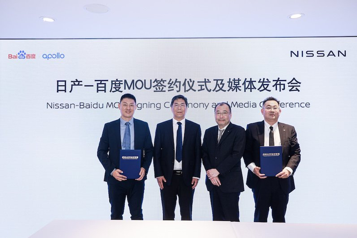 与此同时,日产(中国)投资有限公司与百度在线网络技术(北京)有限公司共同签署了谅解备忘录,双方将开展在人工智能(以下简称“AI”)与智能汽车领域战略合作的可行性研究。本次可行性研究的合作内容包含:第一,基于日产汽车智能化平台,发挥百度在生成式AI方面的优势,共同开发和研究相关领域的未来技术发展和商业合作可行性;第二,日产汽车在中国的车型上搭载百度AI解决方案,发掘AI解决方案的发展潜力。并将积极推动研究与合作,共同探索创新技术。