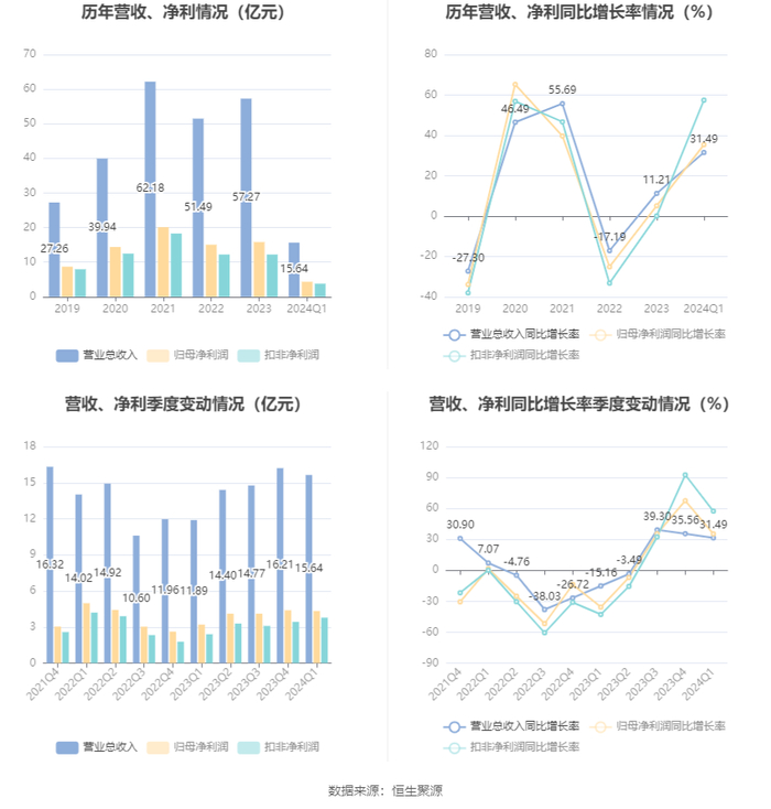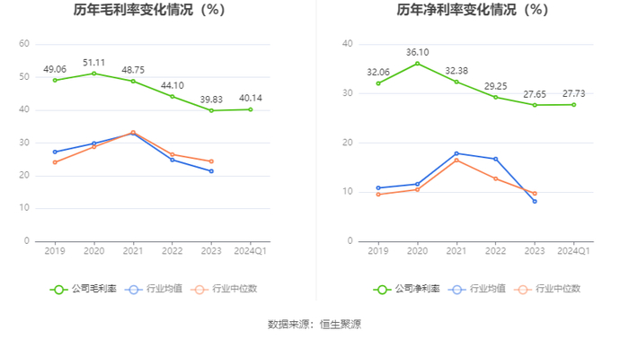 2024年第一季度,公司毛利率为40.14%,同比上升0.73个百分点;净利率为27.73%,较上年同期上升0.77个百分点。
