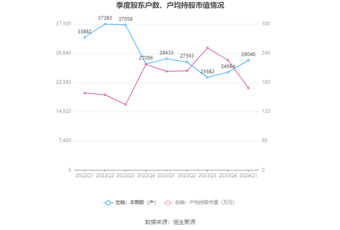 筹码集中度方面,截至2024年一季度末,公司股东总户数为2.8万户,较上年末增长了3062户,增幅12.26%;户均持股市值由上年末的225.91万元下降至168.72万元,降幅为25.32%。