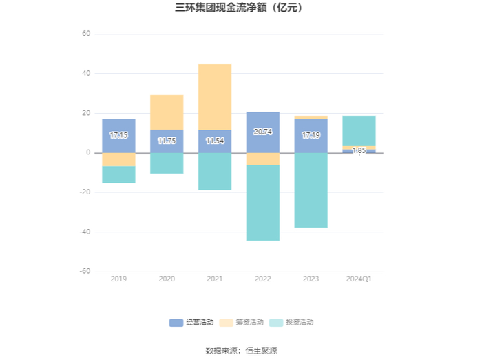2024年第一季度,公司经营活动现金流净额为1.85亿元,同比下降41.59%;筹资活动现金流净额1.60亿元,同比增加8395.18万元;投资活动现金流净额15.29亿元,上年同期为9.65亿元。