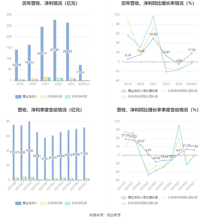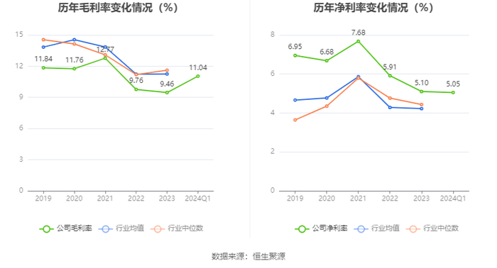 2024年第一季度,公司毛利率为11.04%,同比下降1.42个百分点;净利率为5.05%,较上年同期下降0.76个百分点。