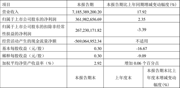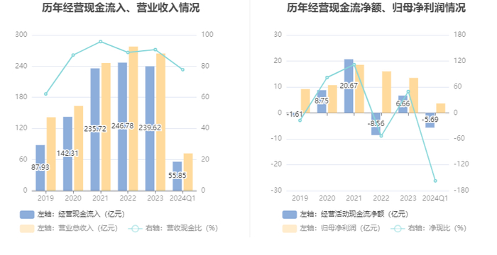 2024年第一季度,公司经营活动现金流净额为-5.69亿元,同比增加22.05万元;筹资活动现金流净额1.85亿元,同比增加3.17亿元;投资活动现金流净额-9.45亿元,上年同期为4.74亿元。