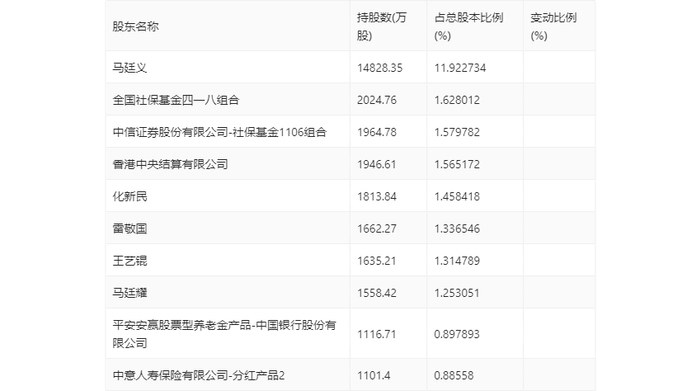 一季报显示,2024年一季度末公司十大流通股东中,新进股东为平安安赢股票型养老金产品-中国银行股份有限公司,取代了上年末的李可伟。在具体持股比例上,全国社保基金四一八组合、中信证券股份有限公司-社保基金1106组合、香港中央结算有限公司持股有所上升,马廷义、化新民、雷敬国、王艺锟、马廷耀、中意人寿保险有限公司-分红产品2持股有所下降。