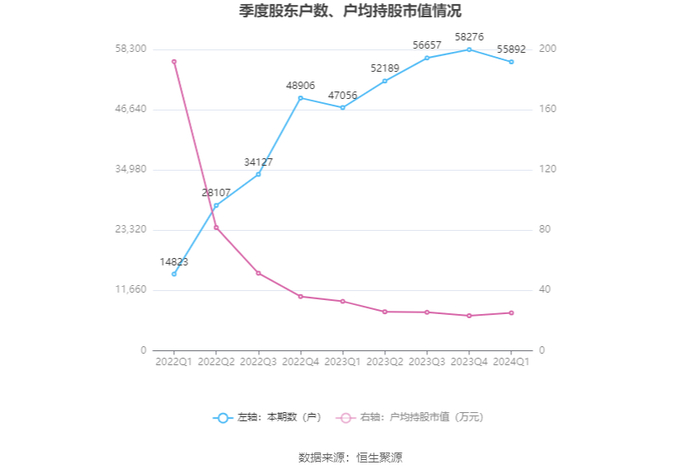 筹码集中度方面,截至2024年一季度末,公司股东总户数为5.59万户,较上年末下降了2384户,降幅4.09%;户均持股市值由上年末的23.20万元上升至25.08万元,增幅为8.10%。