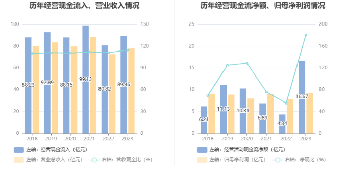 2023年,公司营业收入现金比为114.76%,净现比为180.39%。