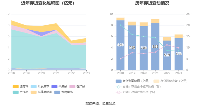 从存货变动来看,截至2023年年末,公司存货账面价值为5.73亿元,占净资产的8.61%,较上年末增加4368.75万元。其中,存货跌价准备为6357.94万元,计提比例为9.99%。