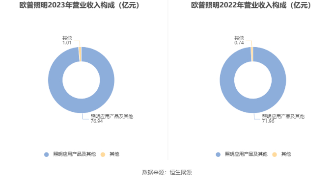分产品来看,2023年公司主营业务中,照明应用产品及其他收入76.94亿元,同比增长6.93%,占营业收入的98.7%。