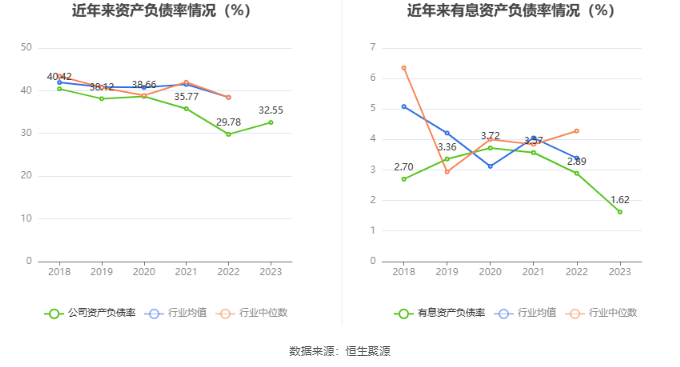 在偿债能力方面,公司2023年年末资产负债率为32.55%,相比上年末上升2.77个百分点;有息资产负债率为1.62%,相比上年末下降1.27个百分点。