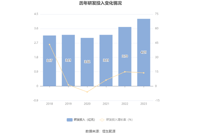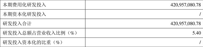 2023年全年,公司研发投入金额为4.21亿元,同比增长13.89%;研发投入占营业收入比例为5.40%,相比上年同期上升0.32个百分点。此外,公司全年研发投入资本化率为0。