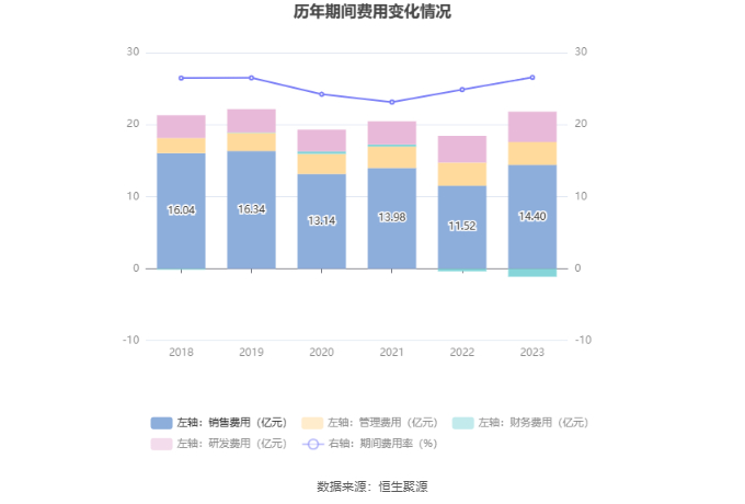 2023年,公司期间费用为20.69亿元,较上年同期增加2.62亿元;期间费用率为26.55%,较上年同期上升1.69个百分点。其中,销售费用同比增长25.01%,管理费用同比下降1.16%,研发费用同比增长13.89%,财务费用由去年同期的-3676.33万元变为-1.11亿元。